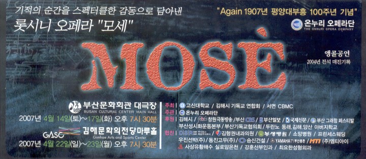 Sop. 이윤정, 롯시니 오페라 "모세" 출연 페이지 정보 작성자 관리자 작성일2007-04-10 이전글 다음글 본문 - 롯시니 오페라 "모세" 공연 - * 일 시 : 4월 14일(토) 오후7시 30분 * 장 소 : 부산 문화회관 대극장 * 주 관 : 온누리 오페라단 * 출 연 : '모세' 역 - Base 권영기 '아나이데' 역 - Sop. 이윤정 外 목록